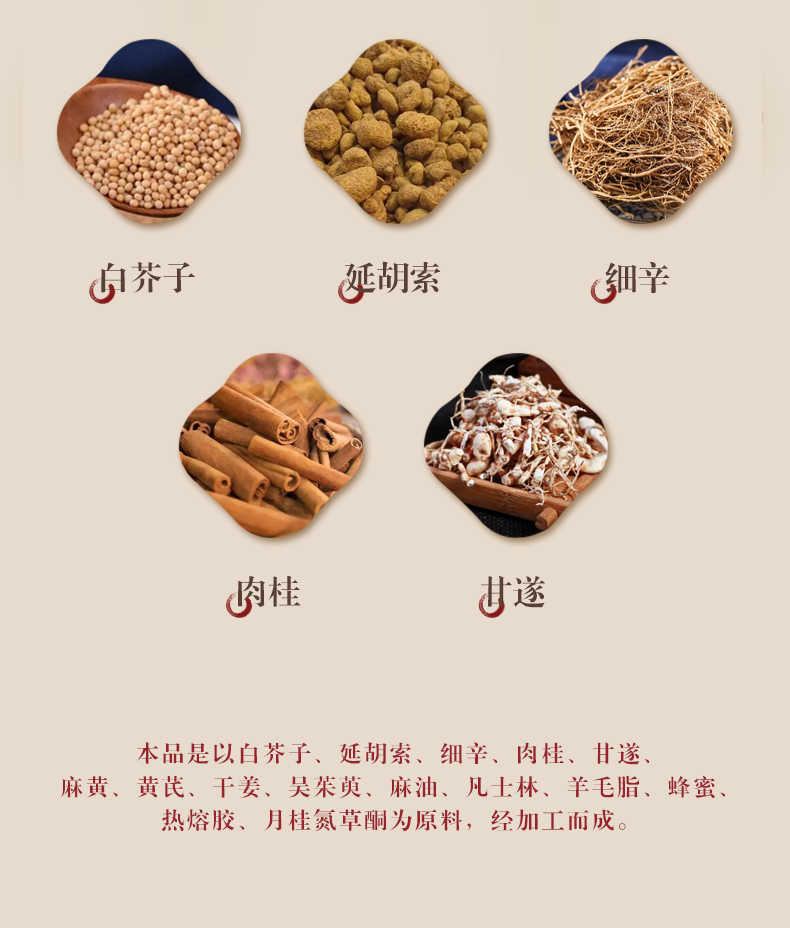 【产品说明】本品是以白芥子、延胡索、细辛、肉桂、甘遂、麻黄、黄芪、干姜、吴茱萸、麻油、凡士林、羊毛脂、蜂蜜、热熔胶、月桂氮草酮为原料,经加工而成。